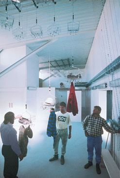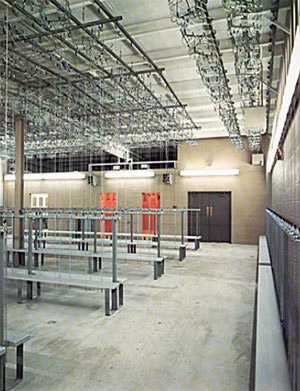 Aisle spaces are not required with Moore LOCKERBASKETS®, except for the main aisles through the changeroom. Experience has shown that raising and lowering of LOCKERBASKETS® occurs in such ratios that the entire ceiling, except for the main aisles, may be employed for LOCKERBASKET® support.